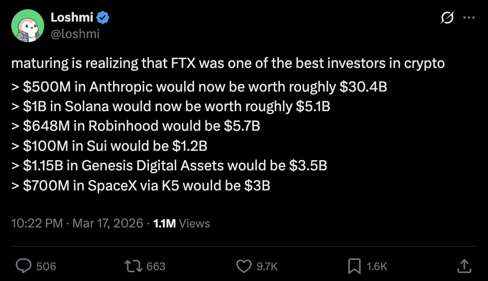In fact, not only was there enough in November 2022 to fully repay customers — with seemingly enough liquidity on the way to process all repayments, in kind, that same month — there could easily have been enough to fully repay customers today, at today’s prices, several times over. In their sentencing letter, the bankruptcy lawyers characterized their work as “digging through the rubble of Mr. Bankman-Fried’s sprawling criminal enterprise to unearth every possible dollar, token or other asset that was spent on luxury homes, private jets, overpriced speculative ventures, and otherwise lost to the four winds” (court docket). But FTX’s Anthropic stake alone would be worth more today than the book value of the entire venture portfolio of 300+ investments at the time of the bankruptcy. The estate also missed out on huge gains from Solana, Sui, Cursor, Circle, Robinhood, Worldcoin, FTT, and the going-concern value of FTX itself. In March 2025, SBF estimated that, had the lawyers not placed FTX into bankruptcy, rather than sitting on $14.5 billion to $16.3 billion of assets today, FTX would have around $93 billion.